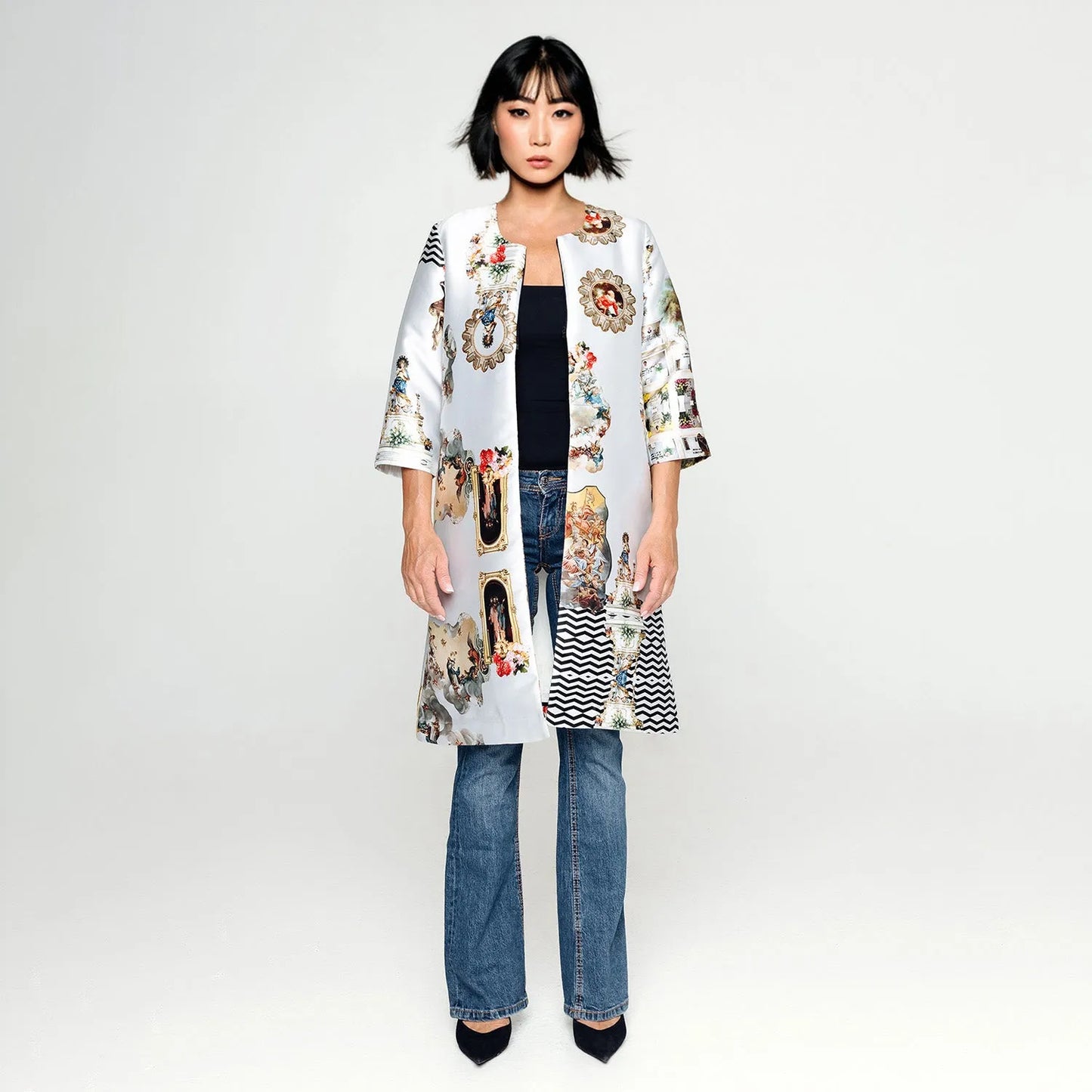 Denne perfekte lette frakke passer til enhver anledning! Det skinnende, silkebløde materiale i 100% vævet viskose fremhæver printet og gør frakken til et unikt statement i sig selv.