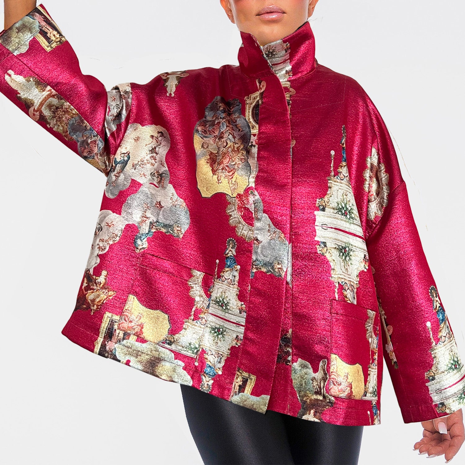 Luxuriöse, kastige Jacke kirchrot gemustert