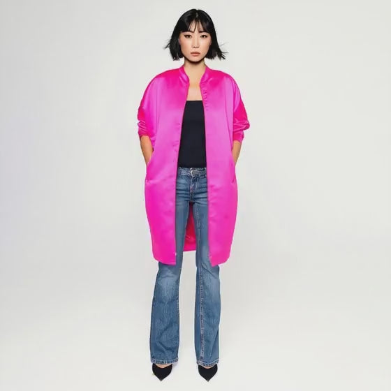 Chinesischer Kragen, Zweiwege-Reißverschluss und Passtaschen an der Seite. Der Mantel ist mit einem rosa glänzenden Luxusfutter gefüttert. Tragen Sie ihn als schicken, lockeren Mantel oder verwandeln Sie ihn mit einem Gürtel in der Taille ganz einfach in ein Kleid!