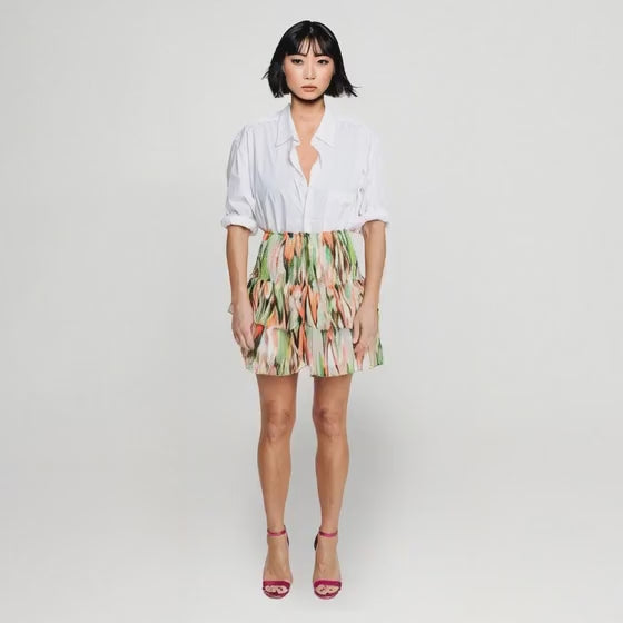 Der Rock verfügt über einen elastischen, breiten Smockbund, der eine entspannte Passform bietet und dabei stilvoll bleibt. Tragen Sie ihn als kurzes, luftiges Kleid oder als Top zu einer engen Jeans für einen lässigen Look.
