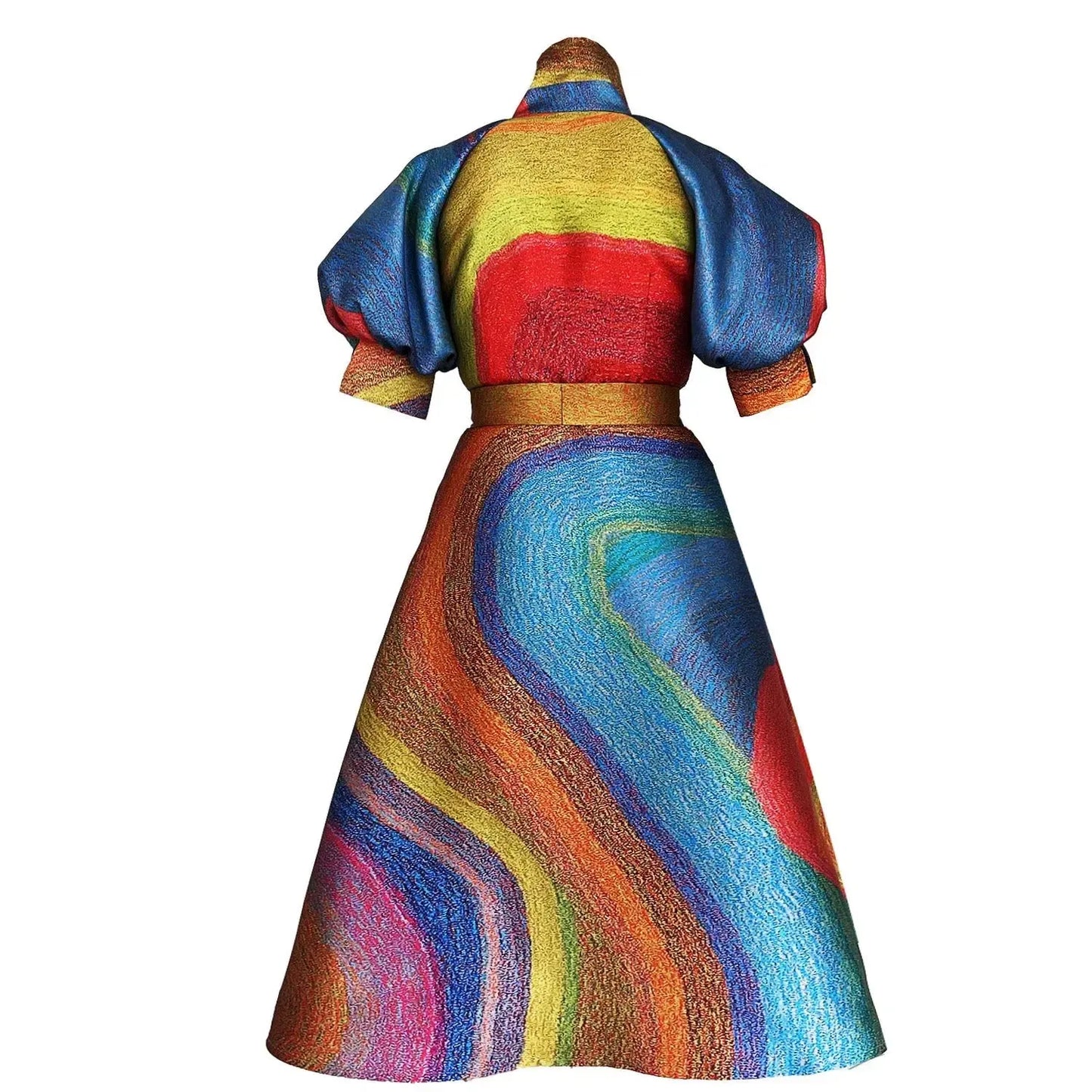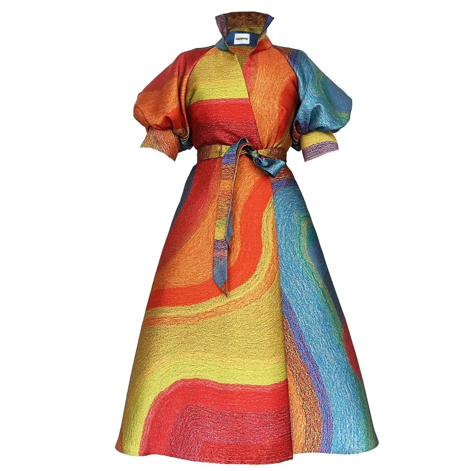 This stunning dress makes a bold statement with its vibrant, artistic print and dramatic silhouette. The tailored bodice features a sharp, structured collar that can be styled up or down for versatility, while the puffed sleeves add a touch of volume and elegance.