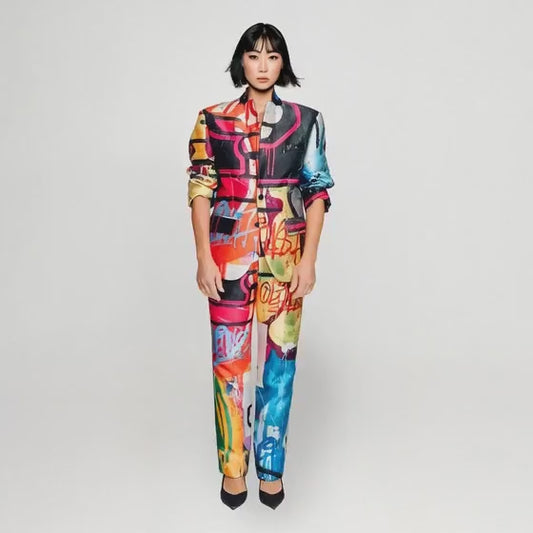 Mönstrade kostymer från maxjenny! kombinerar skarp skrädderikonst med färg och signaturprints. Skulpturala kavajer och byxor skapar moderna kostymer som kan bäras tillsammans eller stylas var för sig. Varje plagg speglar maxjenny!s skandinaviska men internationella formspråk, där djärva mönster möter rena linjer och genomarbetade silhuetter. Resultatet är uttrycksfull skräddning som ger karaktär och närvaro i både vardag och mer uppklädda sammanhang. Designerkostymer skapade för kvinnor som uppskattar färg, form och personlig stil. Leveranstid: cirka 2 veckor.