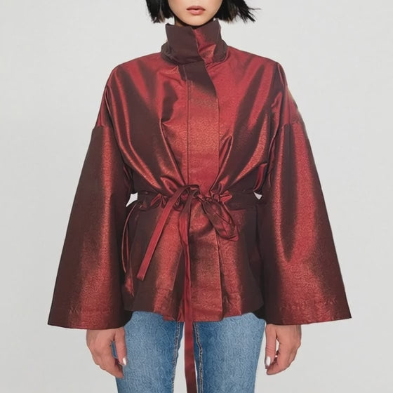 Lyxig boxig jacka i bordeaux med fyrkantig, strukturerad silhuett. Regntät och ventilerande med en subtil glans.