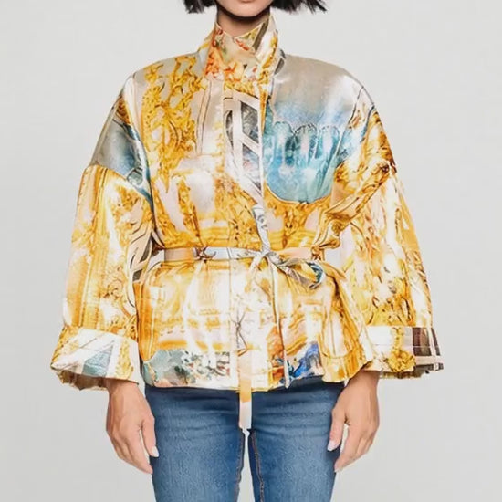 Lyxig fyrkantig boxig jacka i Golden Roof-signaturprint med skulptural silhuett och tydlig närvaro. Designen präglas av ett gyllene lurextyg med skimrande finish. Vida ärmar och dolda framfickor ger både stil och funktion. Ett statement-plagg som passar perfekt med smala byxor för en elegant look. Levereras med ett bälte som ligger fast i en kanal bakpå.