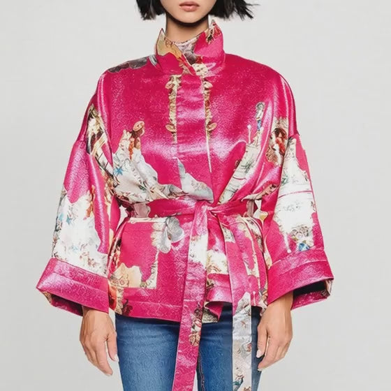 Lyxig fyrkantig boxig jacka i Hot Pink-signaturprint med kraftfull färg och skarp silhuett. Designen präglas av ett gyllene lurextyg med skimrande finish. Vida ärmar och dolda framfickor ger både stil och funktion. Ett statement-plagg som passar perfekt med smala byxor för en elegant look.