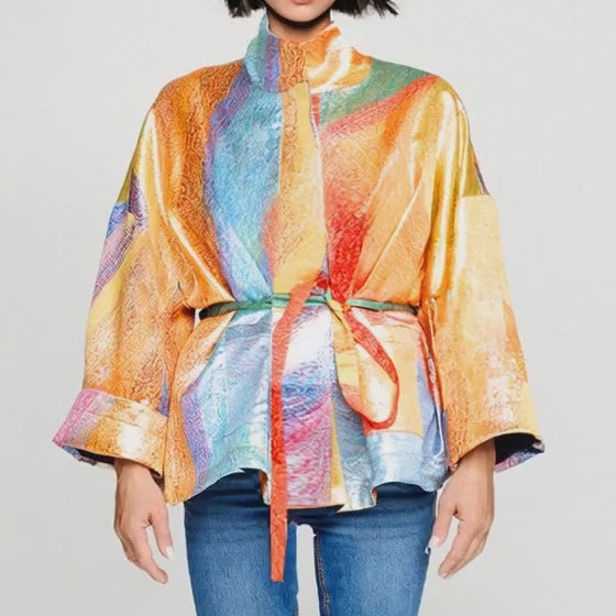 Lyxig fyrkantig boxig jacka i Kasthall-signaturprint med skulptural silhuett och tydlig textilkaraktär. Designen präglas av ett gyllene lurextyg med skimrande finish. Vida ärmar och dolda framfickor ger både stil och funktion. Ett statement-plagg som passar perfekt med smala byxor för en elegant look.