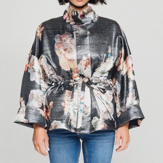 Lyxig fyrkantig boxig jacka i Sicily Black-signaturprint med kraftfull silhuett och tidlös attityd. Designen präglas av ett gyllene lurextyg med skimrande finish. Vida ärmar och dolda framfickor ger både stil och funktion. Ett statement-plagg som passar perfekt med smala byxor för en elegant look.
