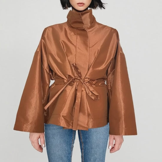 En lyxig, kort jacka med en distinkt fyrkantig, boxig silhuett och hög ståkrage. Designen präglas av vida ärmar och diskreta, mönstrade dolda framfickor som kombinerar uttryck och funktion.