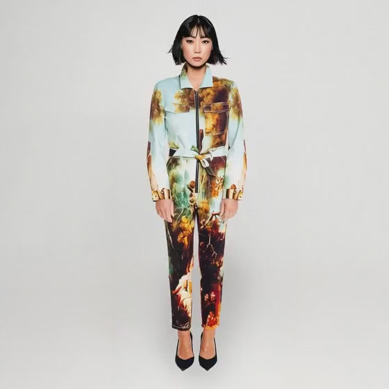 Formule 1-inspirerad denimjumpsuit i Garden Royal-signaturprint med markerad silhuett. Vår ikoniska Maxjenny-jumpsuit är tillbaka, dränkt i färg, energi och uttryck. Varje nyans, varje detalj berättar en historia om rörelse och modern konst.
