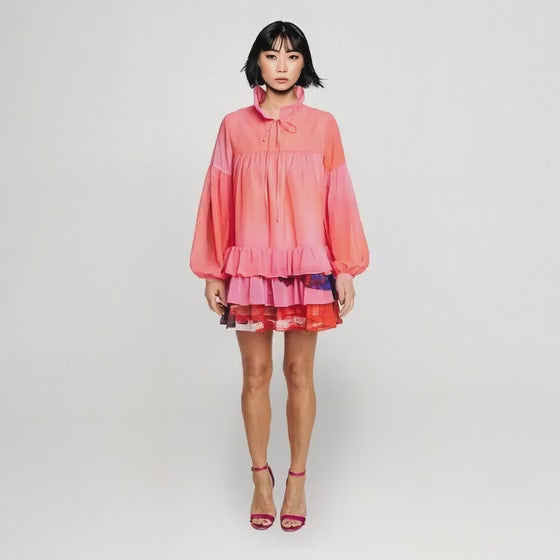 Iris mini klänning i Red Blue Landscape-signaturprint med luftig form och modern silhuett. Tillverkad i lätt chiffong med mjukt fall och flödande rörelse som fångar ljuset.