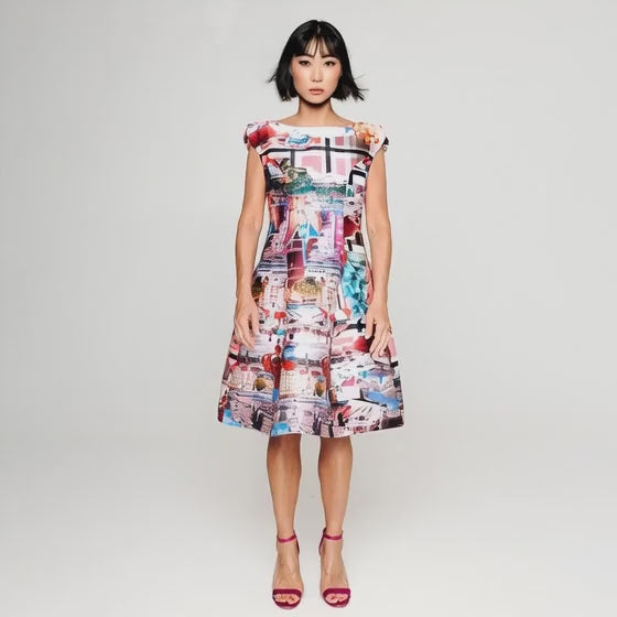 Midi klänning i Stockholm Royal-print med markerad silhuett och rosa mönster. Klänningen har en spännande axeldel som är superfin mot dina armar. Ärmarna, midjan och den voluminösa kjolen ger den perfekta kombinationen och ger stil och klass till varje kvinna.
