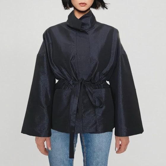 En lyxig, kort jacka med en distinkt fyrkantig, boxig silhuett och hög ståkrage. Designen präglas av vida ärmar och diskreta, mönstrade dolda framfickor som kombinerar uttryck och funktion.