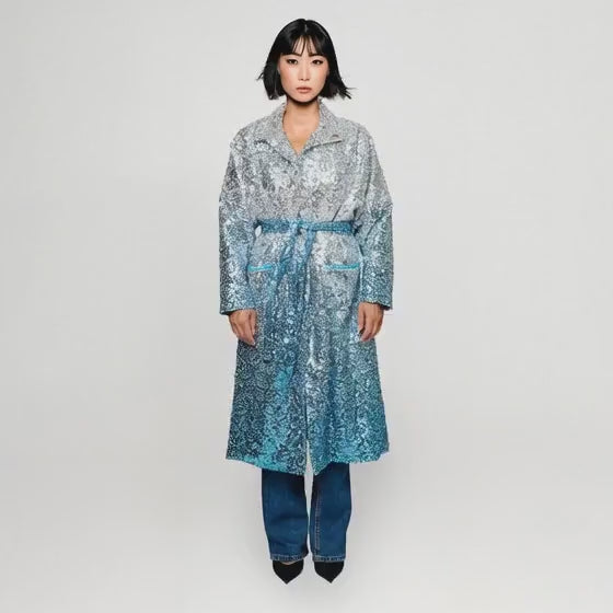 Tillverkad av hållbart och slitstarkt paljettmaterial från deadstock lanserar vi denna fantastiska kappa som en stor, chunky one-size, oversized för att passa alla. Använd med bälte för en figurnära look eller lös för en självständig, avslappnad "här är jag"-stil.