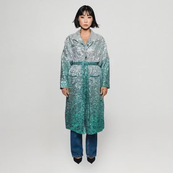 Tillverkad av hållbart och slitstarkt paljettmaterial från deadstock lanserar vi denna fantastiska kappa som en stor, chunky one-size, oversized för att passa alla. Använd med bälte för en figurnära look eller lös för en självständig, avslappnad "här är jag"-stil.