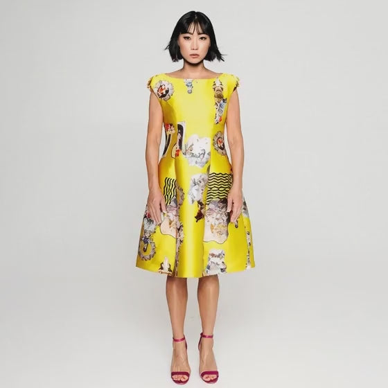 Midi klänning i Sicily gul signaturprint med skulptural silhuett. Klänningen har en spännande axeldel som är superfin mot dina armar. Ärmarna, midjan och den voluminösa kjolen ger den perfekta kombinationen och ger stil och klass till varje kvinna.