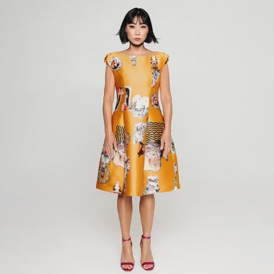 Midi klänning i Sicily senap signaturprint med skulptural silhuett. Klänningen har en spännande axeldel som är mycket dekorerande mot dina armar . Ärmarna, midjan och den voluminösa kjolen är den perfekta kombinationen och ger stil och klass till varje kvinna som bär den.