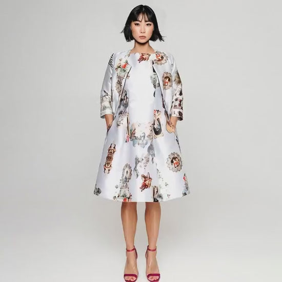 Klänningen är gjord i en glänsande vävd viskos, har fickor i sidsömmarna, en osynlig dragkedja baktill och foder för komfort och volym.