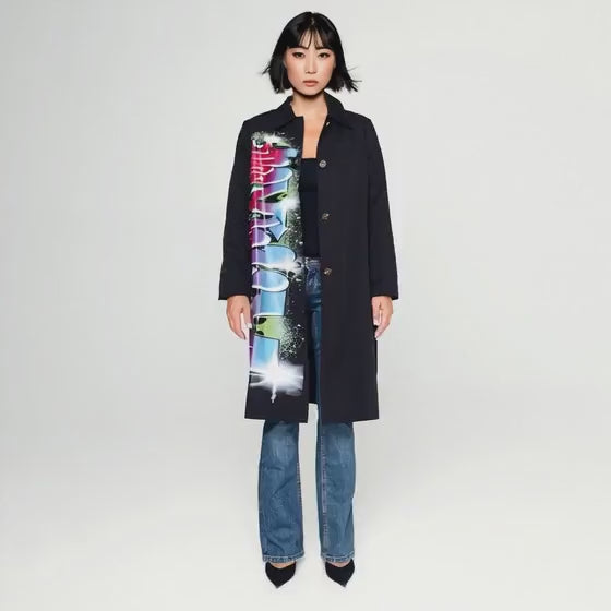 Statement-trenchcoat i svart signaturmönster med skarp silhuett och dramatisk närvaro. Klassisk och stilren trenchcoat i sann maxjenny!-stil. En innovation.