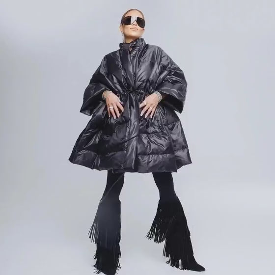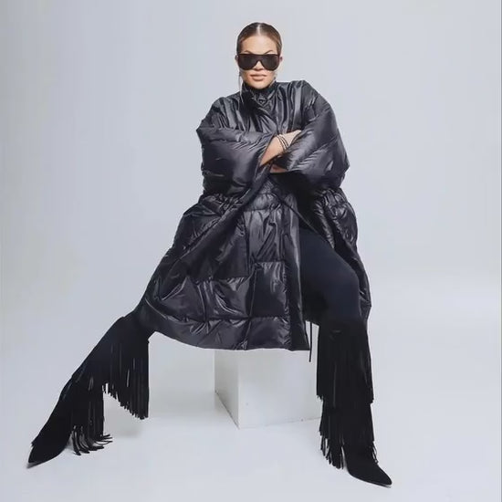 Oversized dunkappa i svart med fyrkantig, skulptural silhuett.