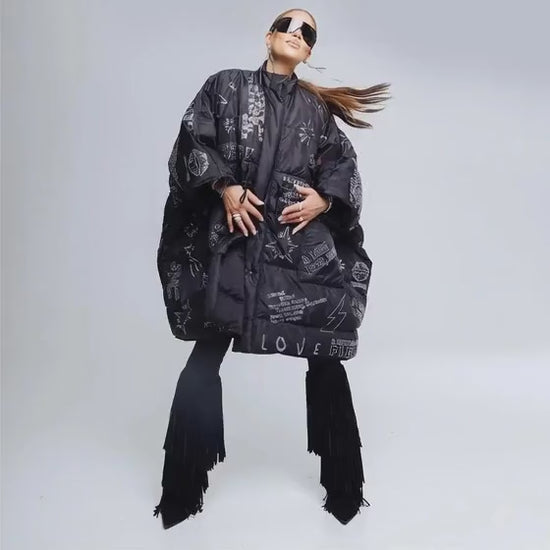 Oversized dunkappa i svart med fyrkantig silhuett och exklusiva Swarovski-detaljer.