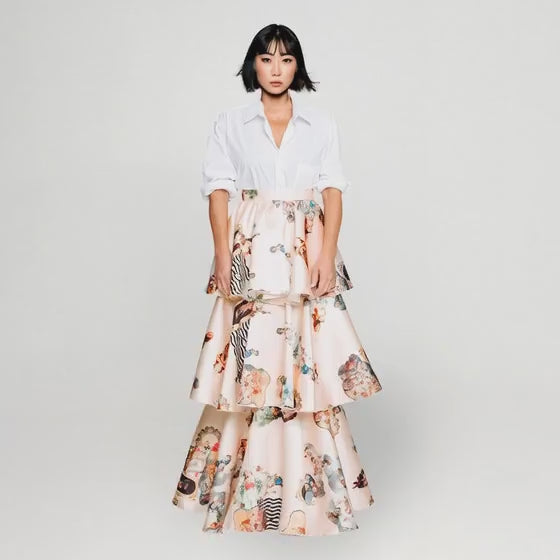 Voluminös trippel aftonkjol i Sicily Champagne-signaturprint med dramatisk silhuett och couture-känsla. Helt otrolig med en C-klänning under som blir en top eller med en kavaj i samma färg med bälte i midjan. En imponerande outfit!